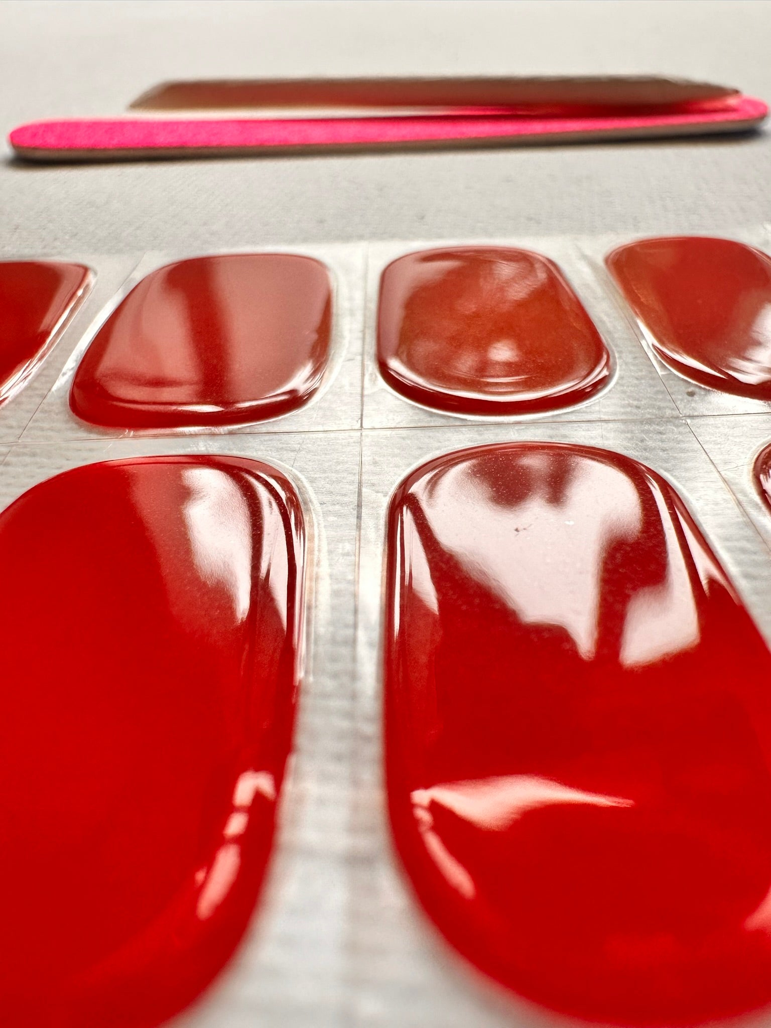 Introducing "London" – your captivating gel nail stickers featuring a rich red hue reminiscent of the iconic red buses of London!
